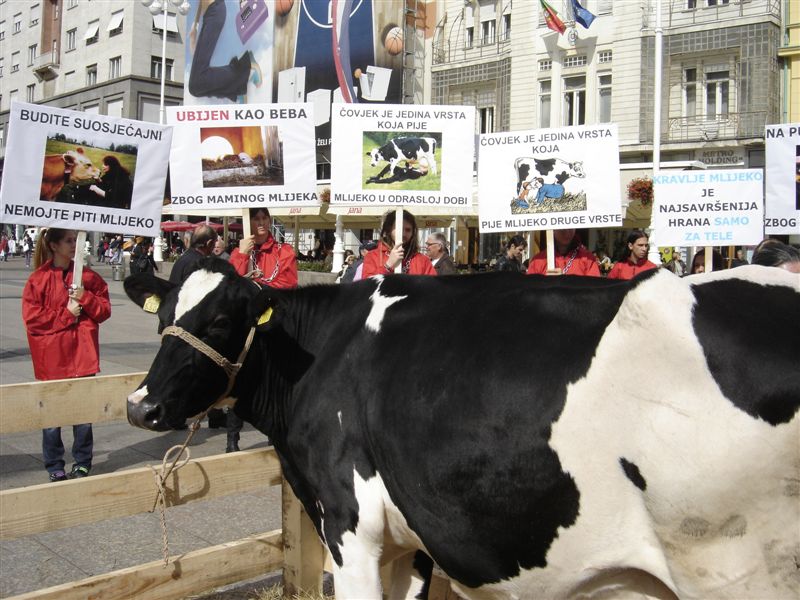 The intensive campaigns of the Croatian dairy industry are focused on the constant deception of consumers by showing cows and veals in pastoral living conditions, on green sunlit fields. They portray cow milk as "the most perfect natural food" which it really is – but for calves. The consumption of milk of other species is completely unnatural, because mothers of other mammals species produce milk suitable for the offspring of their species before they switch to solid food. Humans are the only species which consumes milk of other species and the only species which consums milk in adult age.