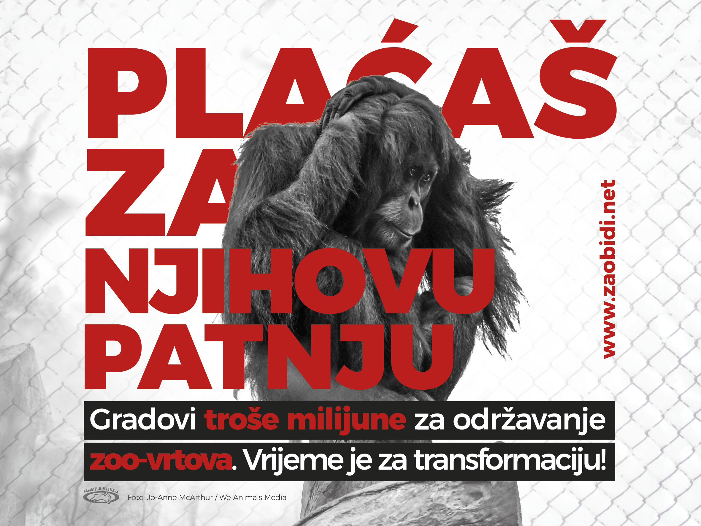 Prošle godine udruga Prijatelji životinja poručivala je građanima s plakata da zaobiđu zoološke vrtove. „Plaćaš za njihovu patnju. Gradovi troše milijune za održavanje zoo-vrtova. Vrijeme je za transformaciju.” - poruka je na novim plakatima Prijatelja životinja koji će osvanuti u Zagrebu, Osijeku, Varaždinu, Rijeci, Splitu, Puli i drugim gradovima. Njome informiraju građane da plaćaju za patnju nevinih zatočenika, čak i ako ne posjećuju zoološke vrtove, čega većina nije svjesna!